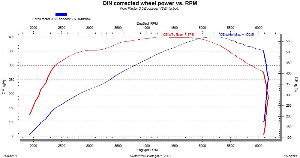 We started off by measuring its power and torque it came with. The spec sheet says that the V6 in the Raptor produces 450 hp and 691 Nm of torque. However, these are crankshaft figures. Figures at the wheel are always lower and our measurements showed that they are at 400.8 hp and 571 Nm of torque.